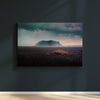 “After the Storm” captures a stark Icelandic landscape suspended between sky and earth. Dark volcanic soil stretches endlessly until it meets a distant emerald-blue mountain, half-veiled in stormlight.
